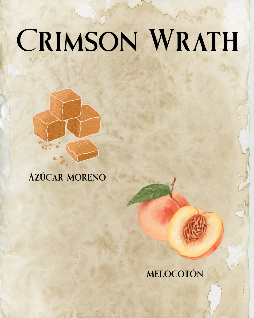 Crimson Wrath es pasión dulce y emoción intensa. El azúcar moreno aporta profundidad caramelizada y el melocotón una nota frutal, jugosa y sensual. Ideal para rituales de atracción, creatividad y conexión emocional, su aroma es cálido, envolvente y ligeramente provocador.