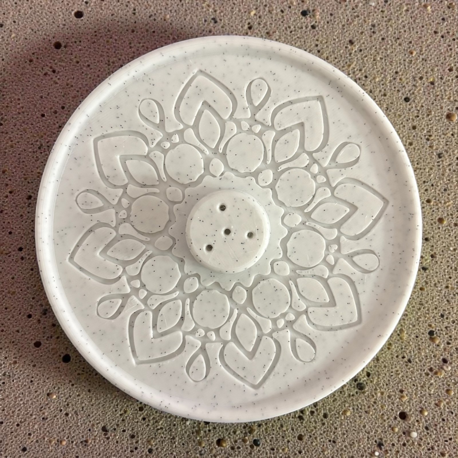 Incensario artesanal efecto granito, realizado mediante impresión 3D para lograr una apariencia pétrea fiel y ritual.