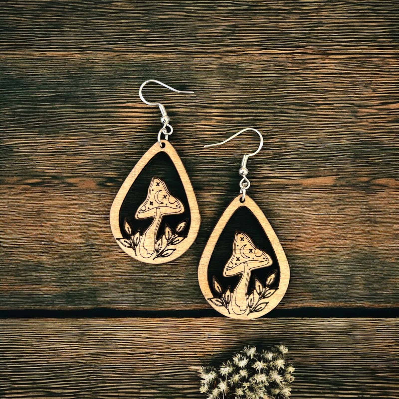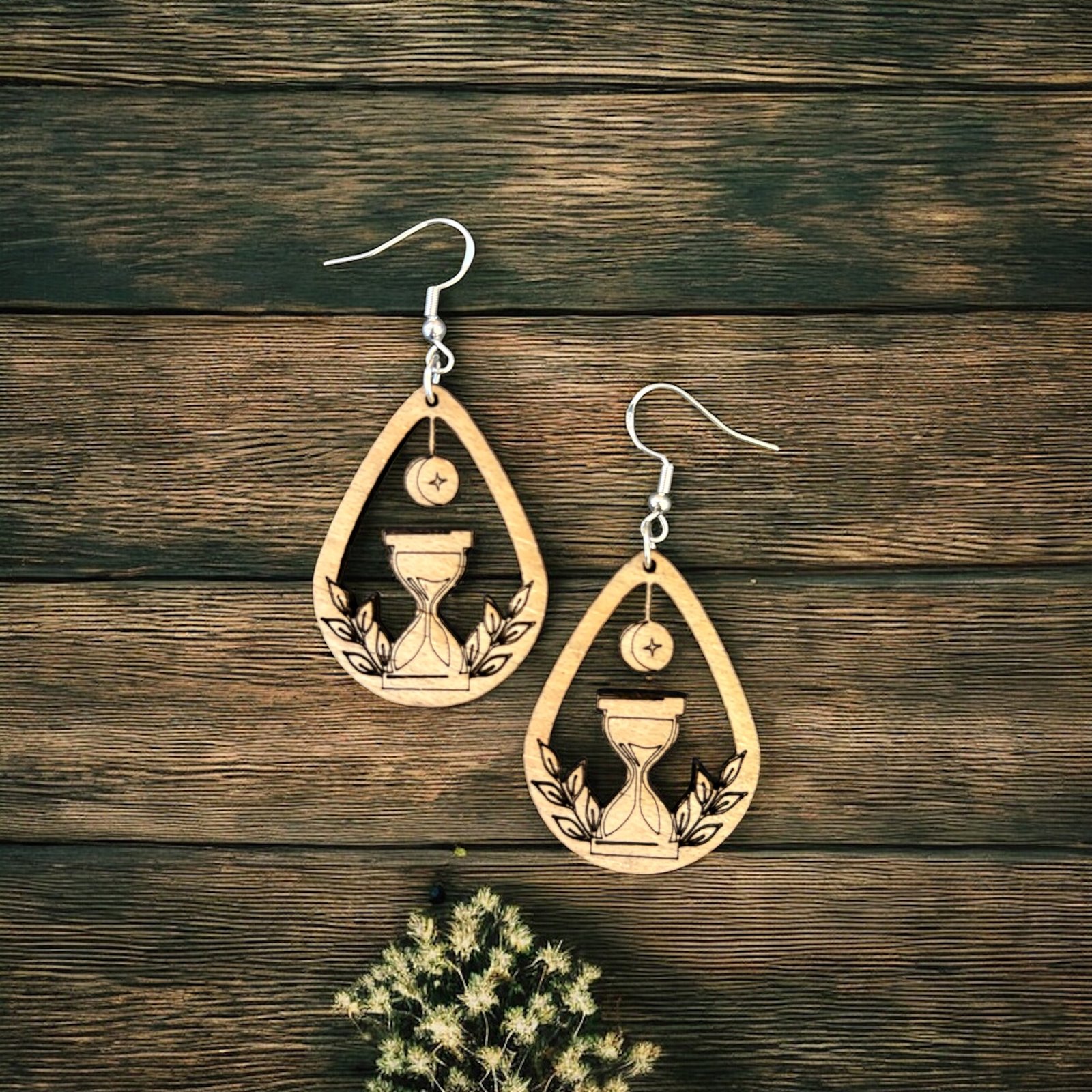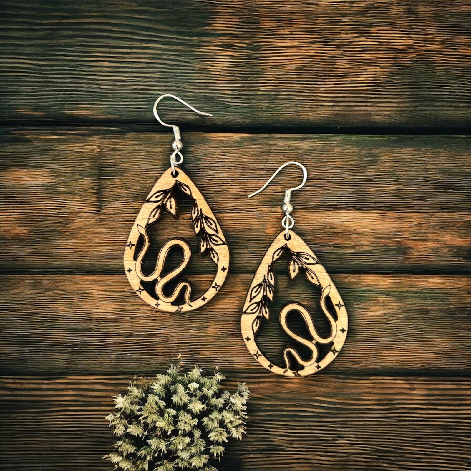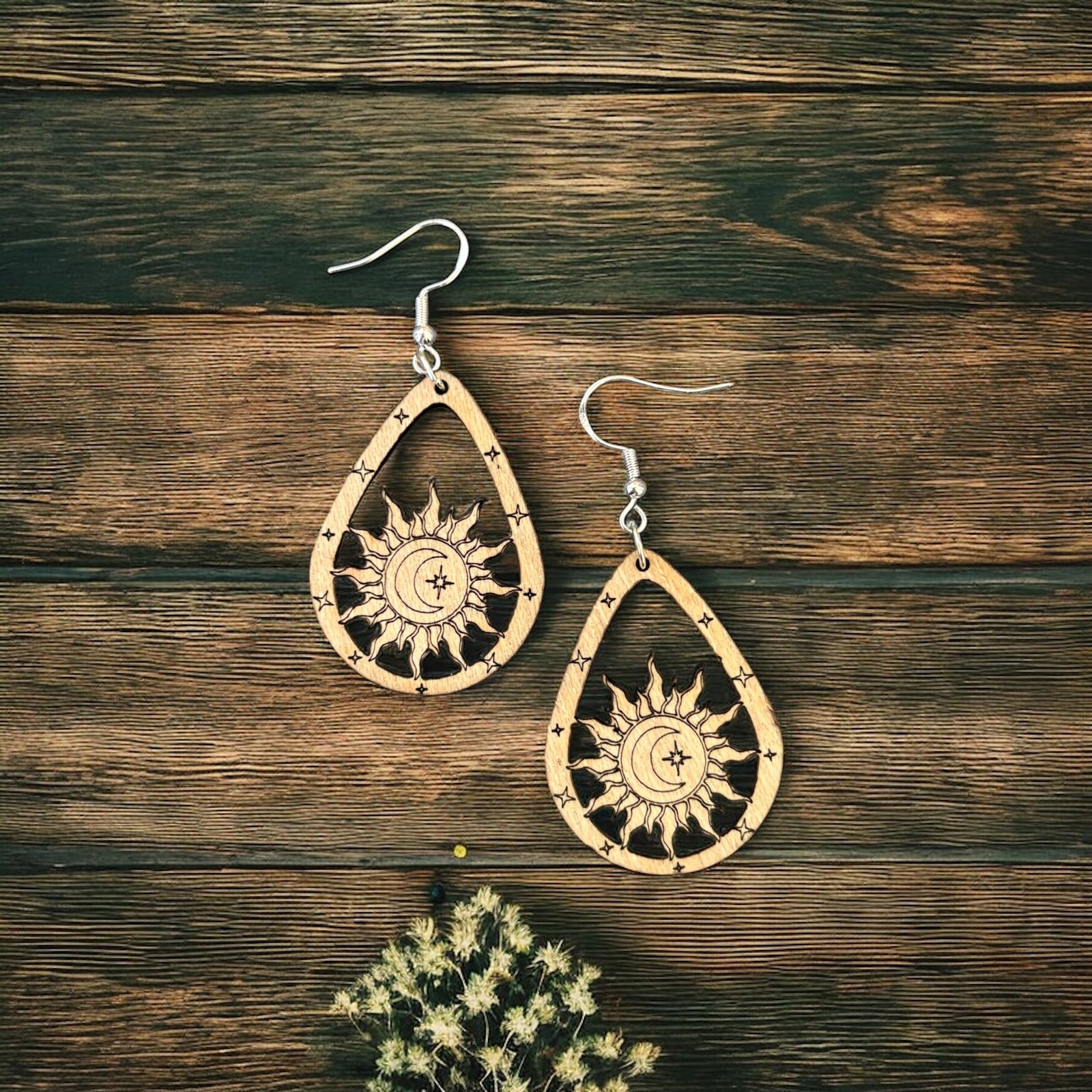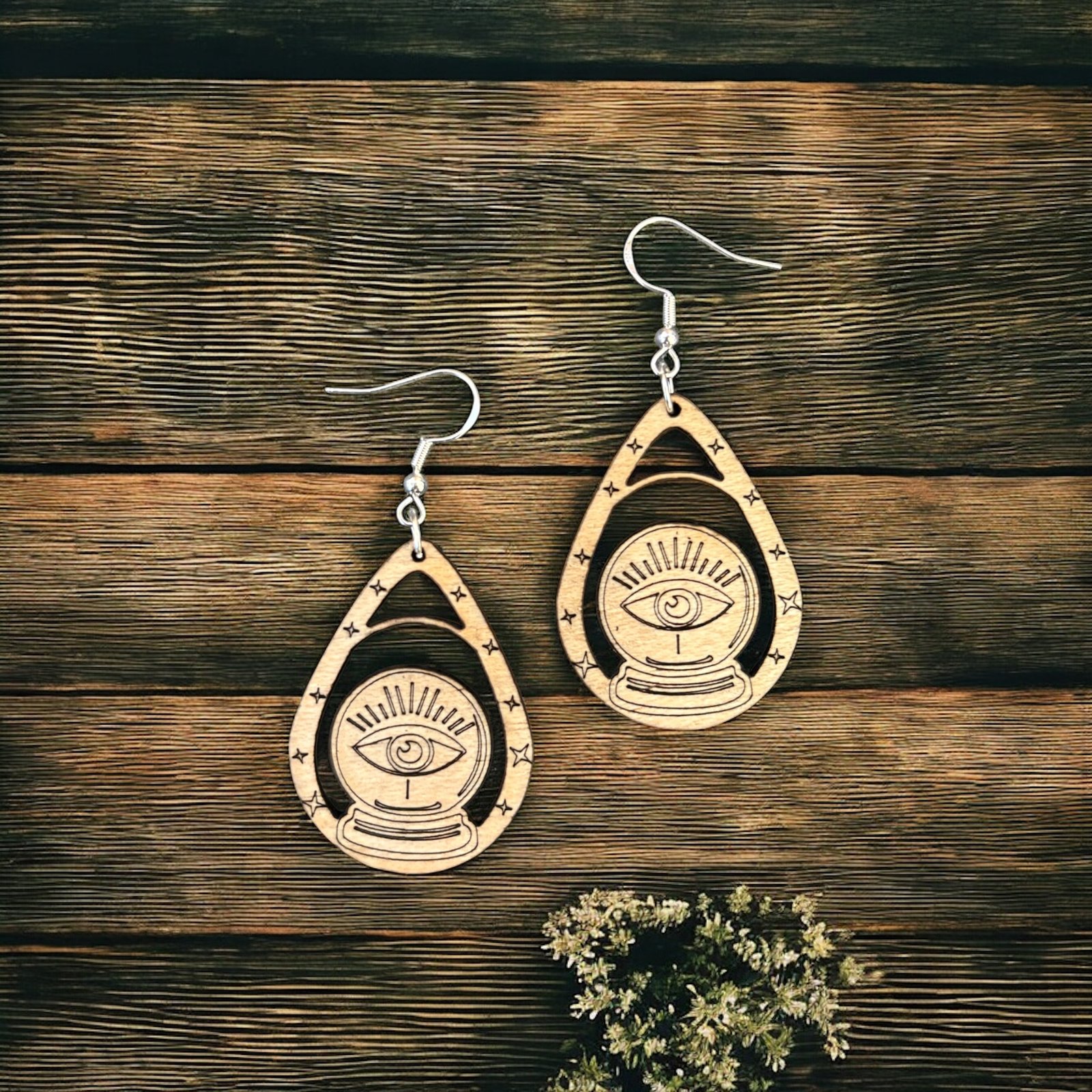 Pendientes de madera pirograbados 🔥✨ 10 modelos mágicos: setas, luna & espada, serpientes, cristales, soles, mariposas, bola de cristal, reloj de arena, velas y pociones. 🖤