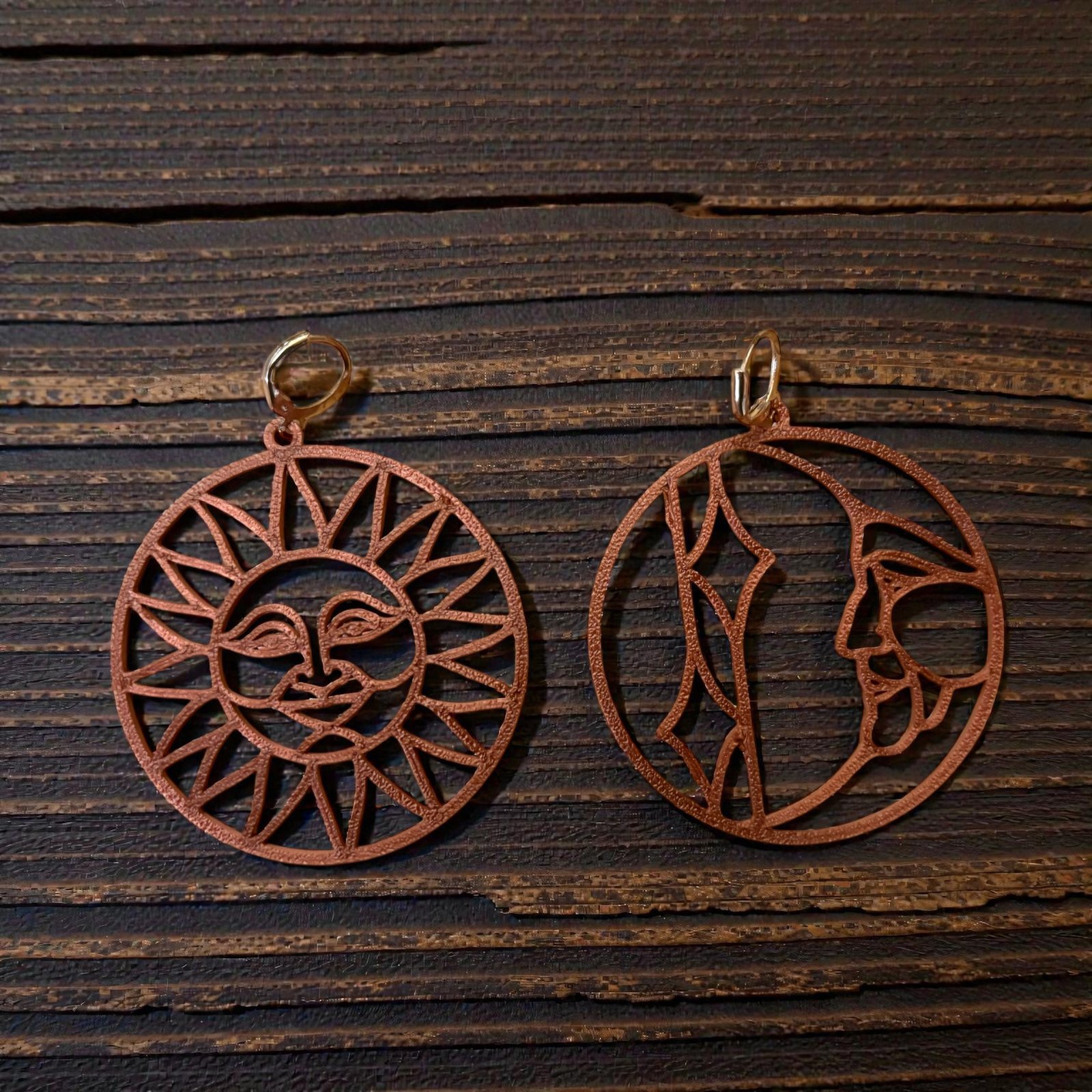 Pendientes Sol y Luna en cobre brillante, fabricados mediante impresión 3D y con enganches de acero. Diseño ligero, cómodo y simbólico, inspirado en la dualidad y el equilibrio. Joyas artesanales con estética mágica y fantástica, exclusivas de The Witcher’s Shop.