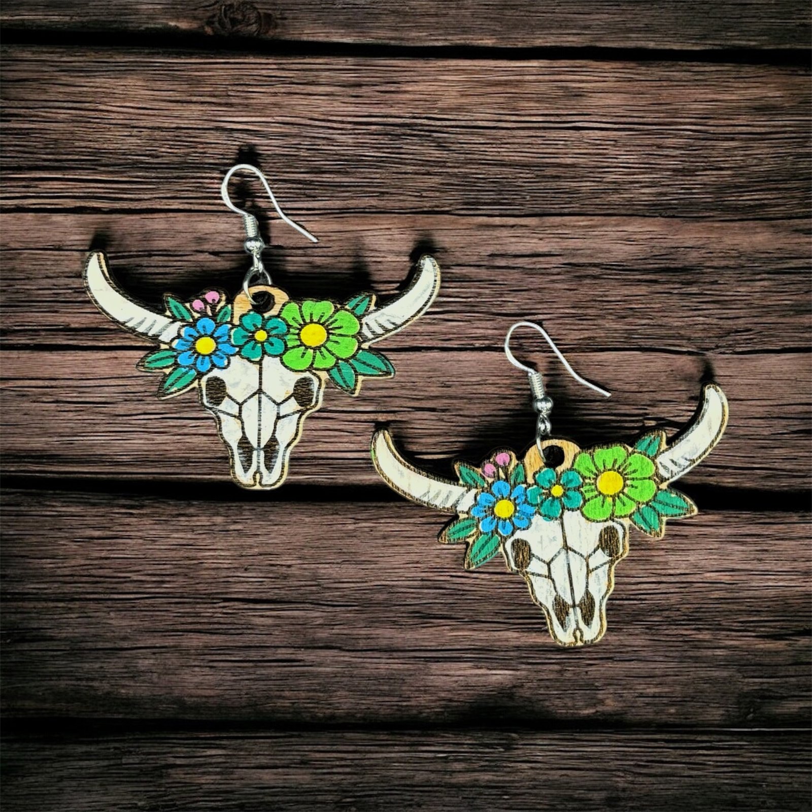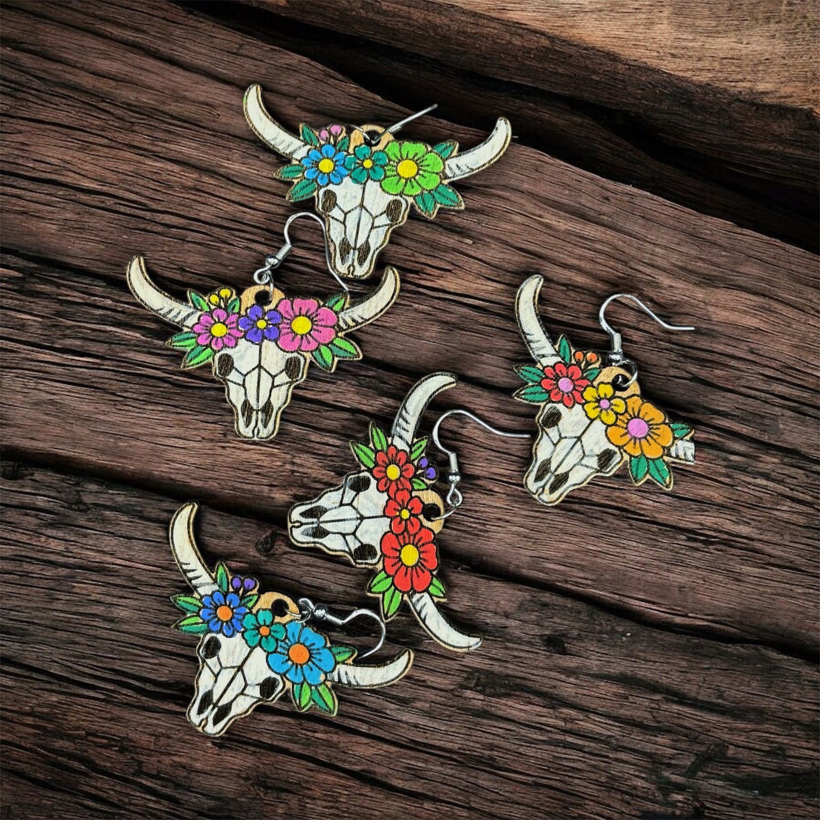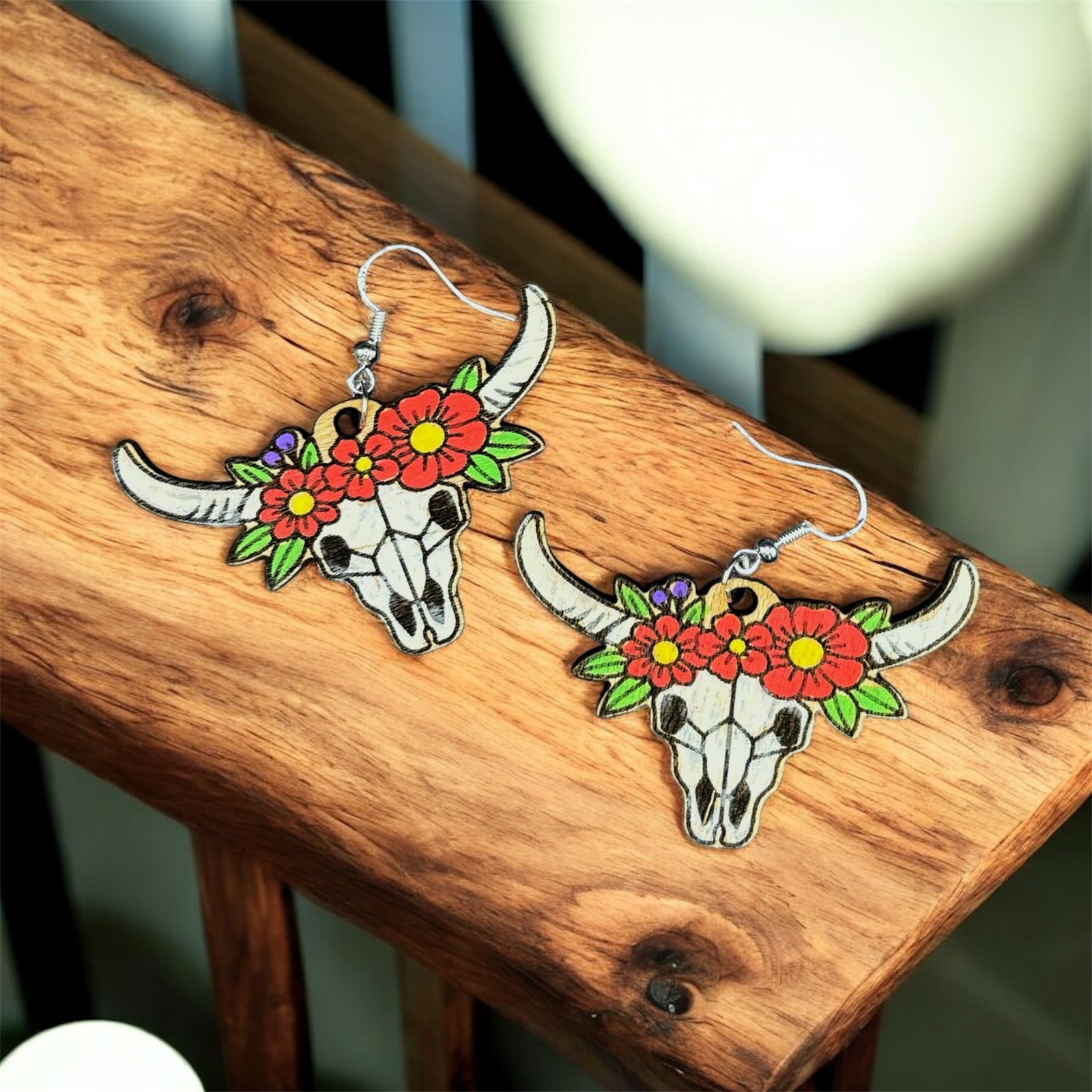 Pendientes de Madera Pirograbados – Estilo Western con Cabeza de Ganado y Corona de Flores