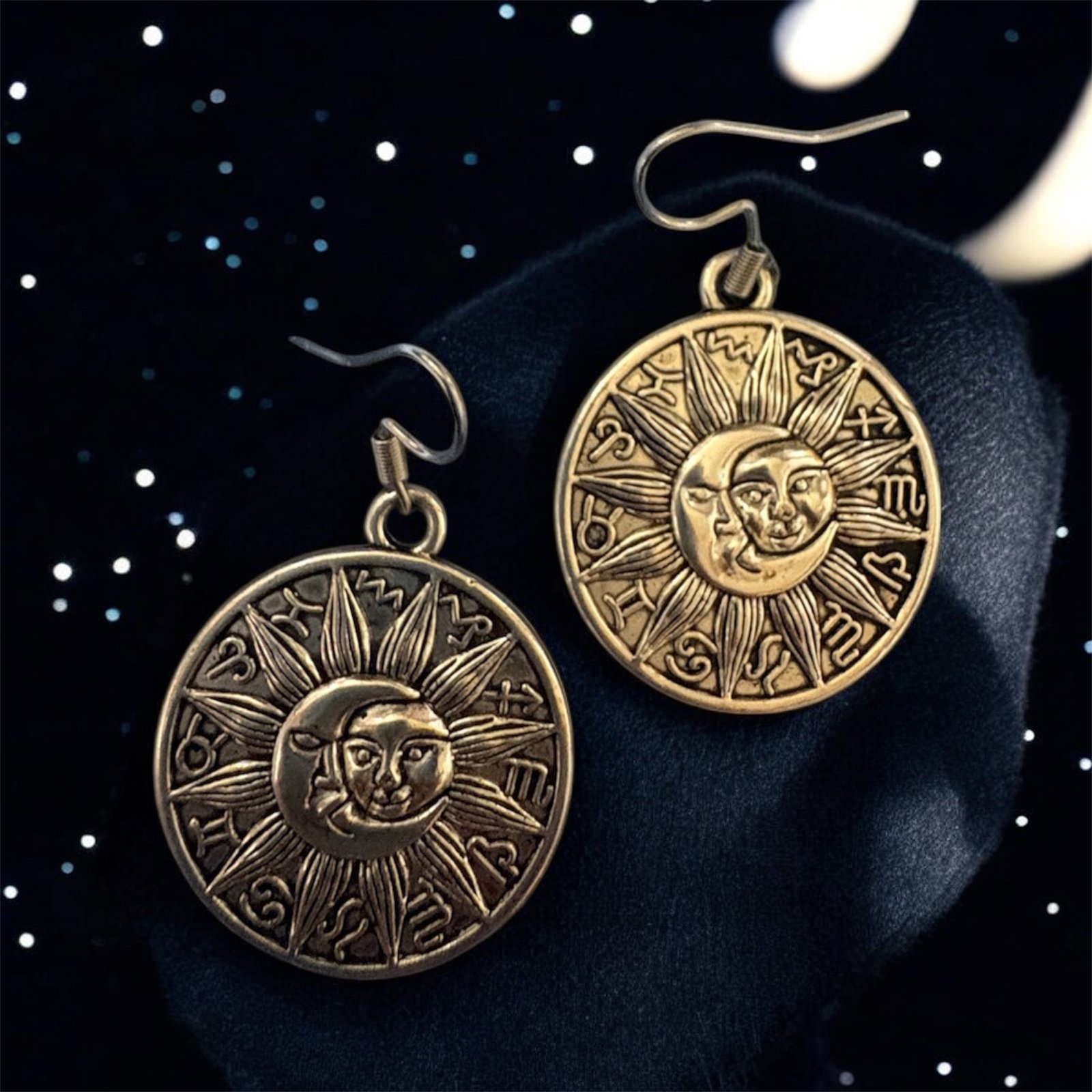 Pendientes celestiales de acero con motivos de soles y zodiacos, y enganche de plata 925.