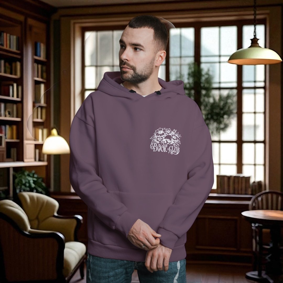 💜 Sudadera púrpura: diseño frontal con logo Book Club (calavera y rosas) y parte trasera con la gran frase Enemies to Lovers, acompañada de guiños a tropes icónicos como slow burn, morally gray y forbidden love.