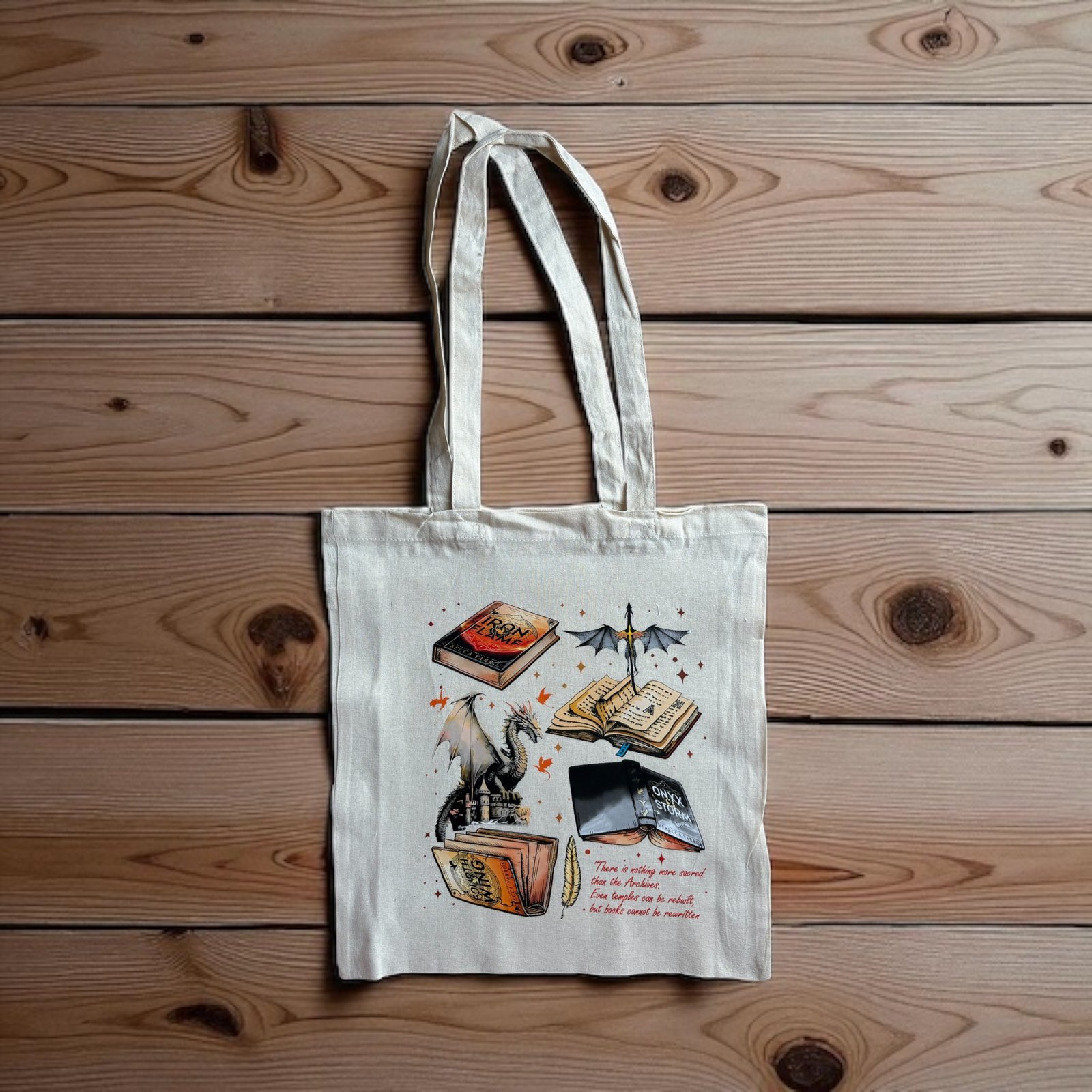 “No hay guerra como la del corazón… y ningún dragón como el que vive entre páginas.” Tote inspirada en Fourth Wing& Iron Flame de Rebecca Yarros.